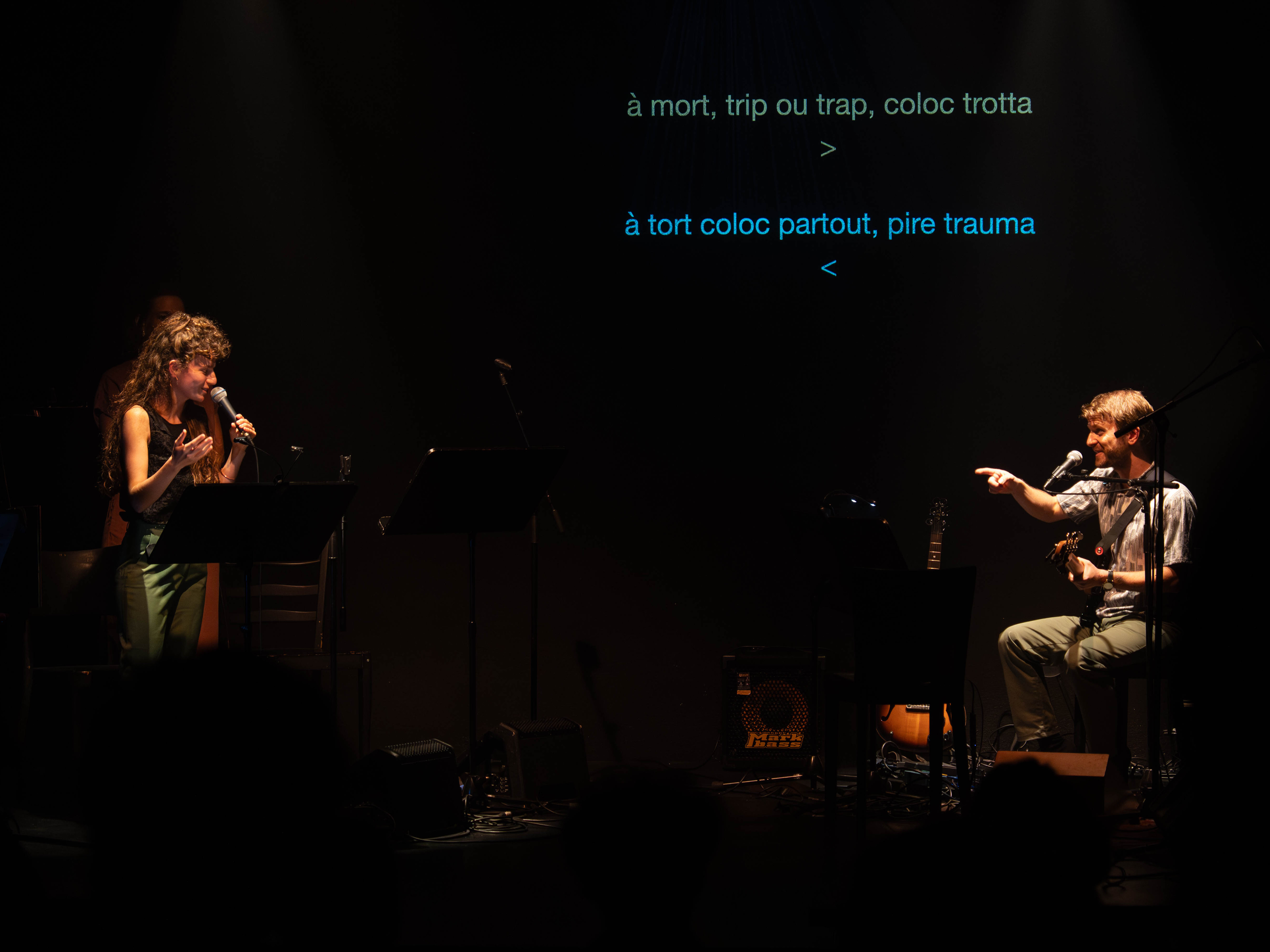 Pauline Mettan (maître assistante au département de français moderne, UNIGE)« Deux chanteuses aux voix magnifiques, très différentes et complémentaires par leur timbre et leur présence. Des mots, encore des mots, ça fait travailler les méninges en rigolant sans cesse, en mettant au cœur de l'œuvre les sons, tous les sons, le mariage des sens. On rit, on réfléchit, on est surpris, on se perd parfois, et ça fait beaucoup de bien ! Des mots et syllabes projetés, entendus, écoutés, chantés, murmurés, on en prend plein la vue et les oreilles. Bravo aux musiciens-conteurs pour cette expérience unique. »