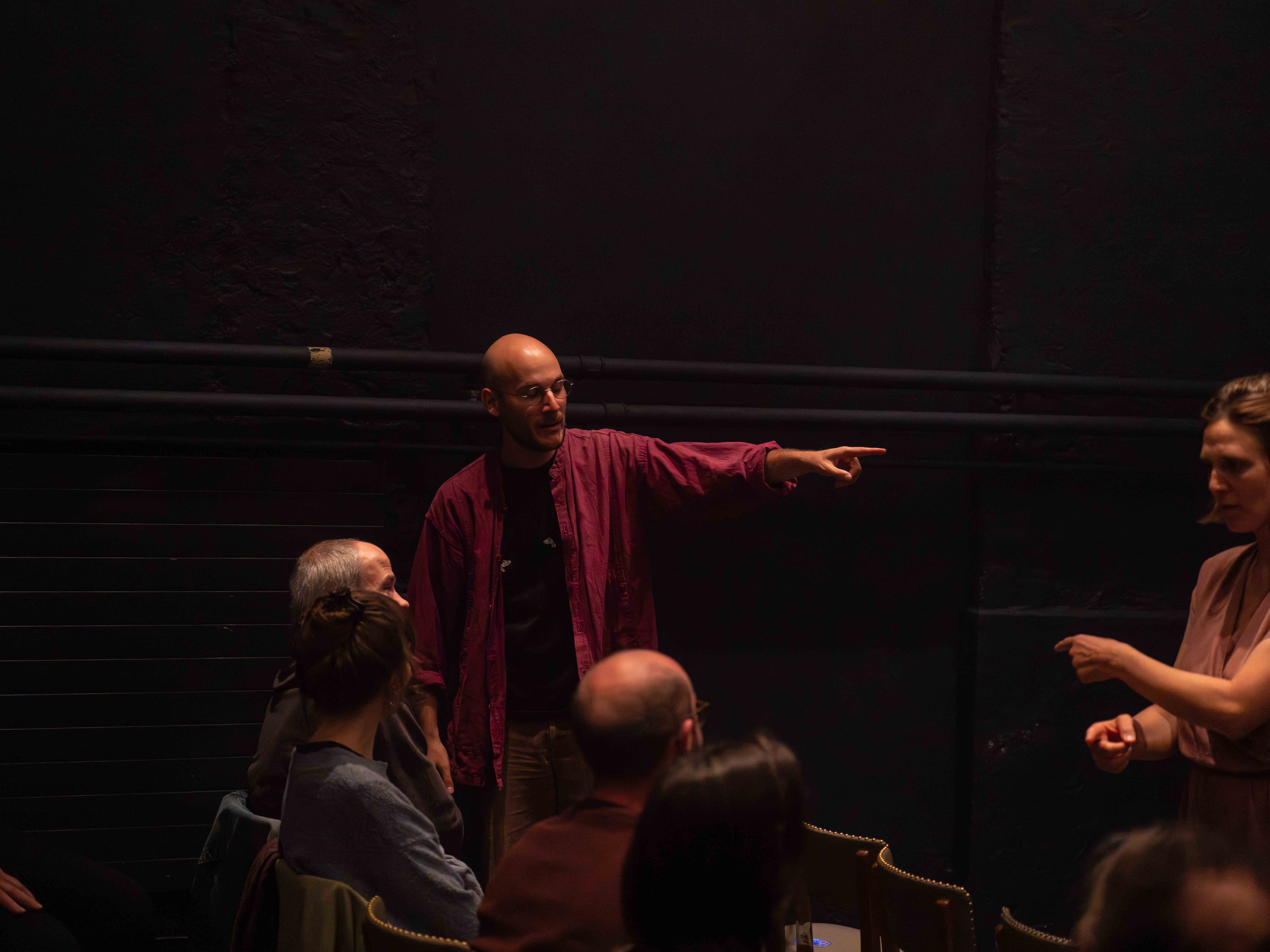 À cela s’ajoute l’utilisation d’un écran, sur lequel du texte sera projeté, tantôt pour créer une dimension supplémentaire à ce que le public entend (par exemple différentes citations de futurs parents qui donnent leur avis sur un prénom qu’on leur propose), tantôt pour permettre de suivre le texte dans ses jeux sonores et autres pirouettes oulipiennes.
